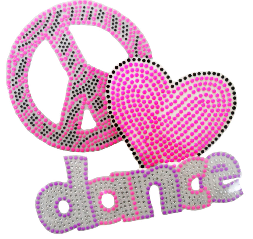 S100813 - Peace Love Dance - Size: 10.25" x 9.5" - Colors: Clear & Jet Black Stones, Flu. Fuchsia, Flu. Purple Nailheads